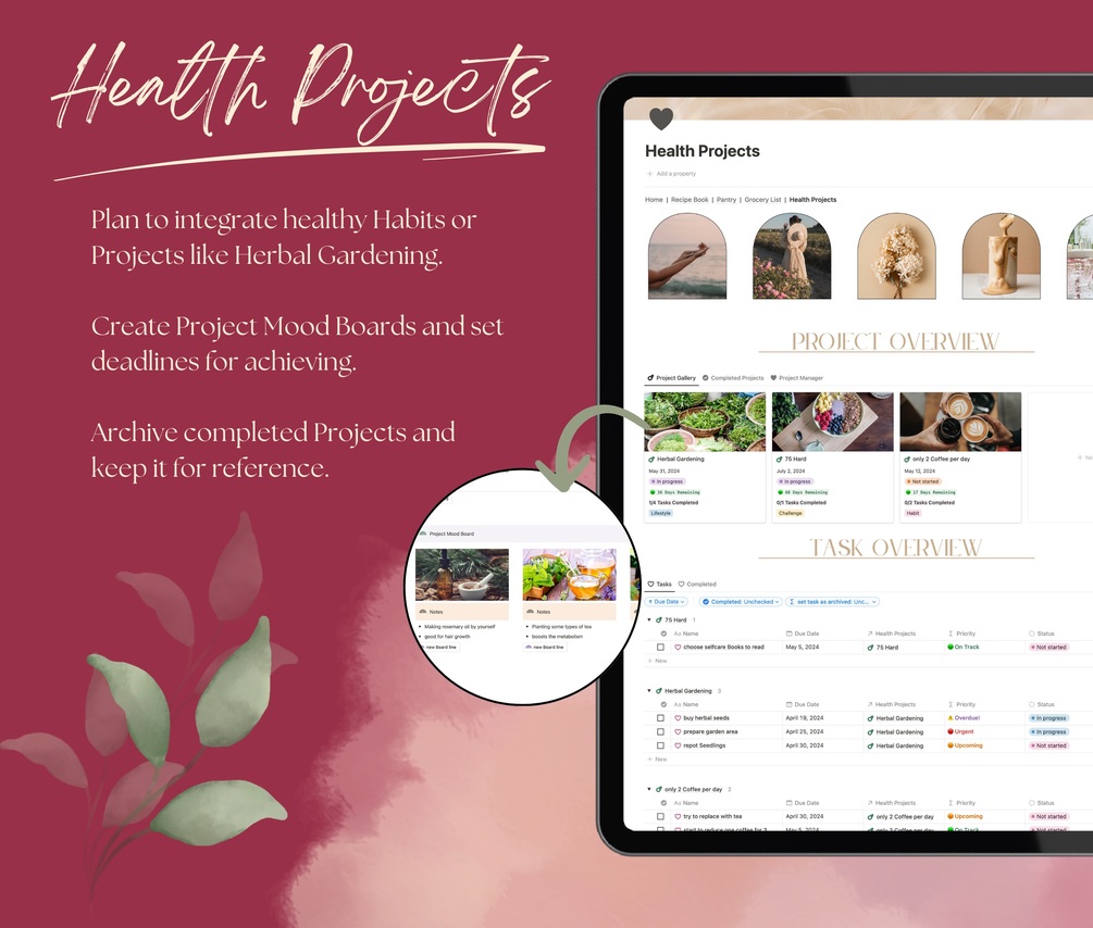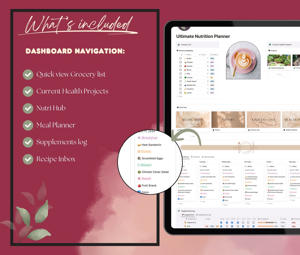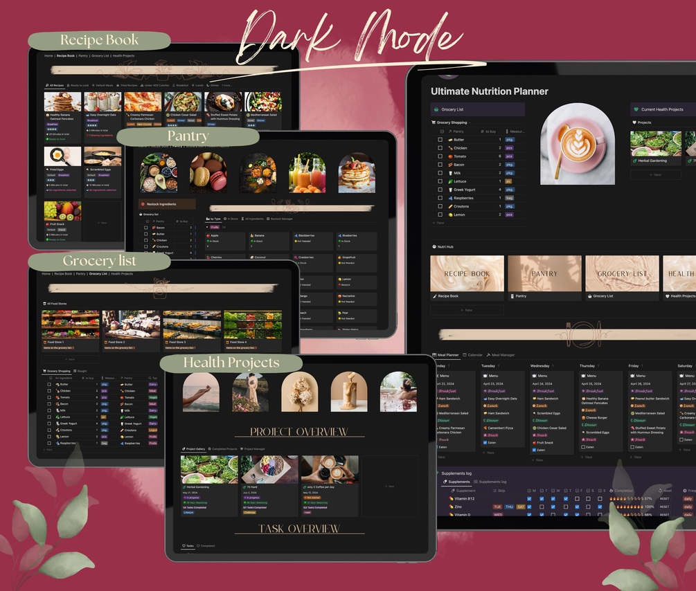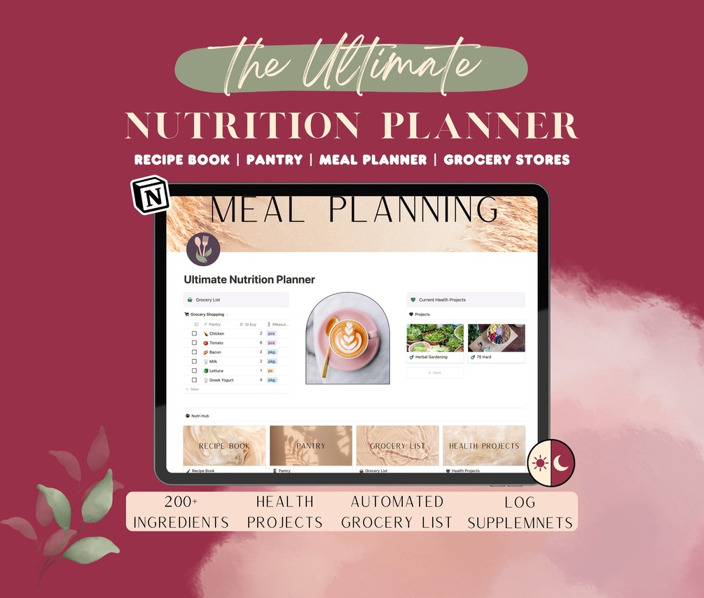Ultimate Nutrition Planner – 200+ Ingredients, Automated Shopping List, Recipe Book, Meal Planner & Health Projects | Notion Template