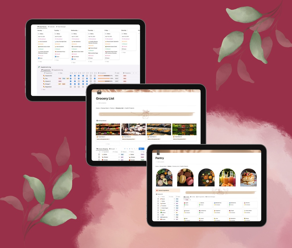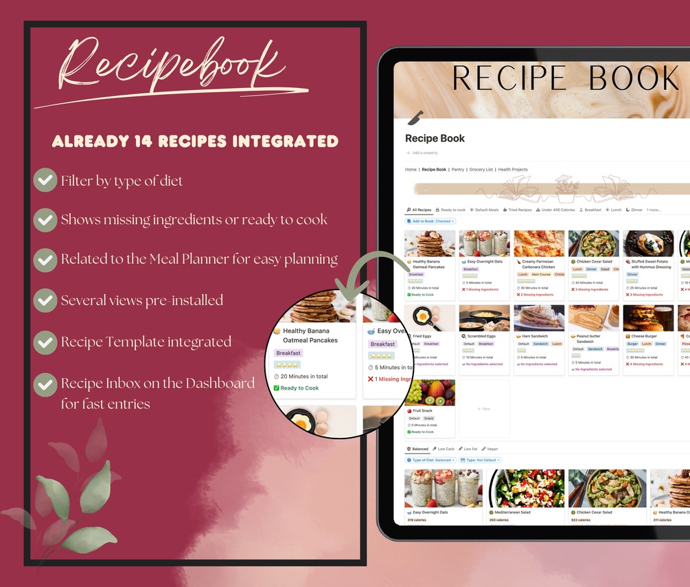 The Ultimate Nutrition Planner for Notion is your perfect tool for effortless and organized meal planning. Alongside many features like the automated shopping list, a pantry list with over 200 pre-defined items, and a recipe book, you'll also receive a Canva template to easily change the images in the template as desired. A detailed tutorial video on YouTube guides you step-by-step through using the template.