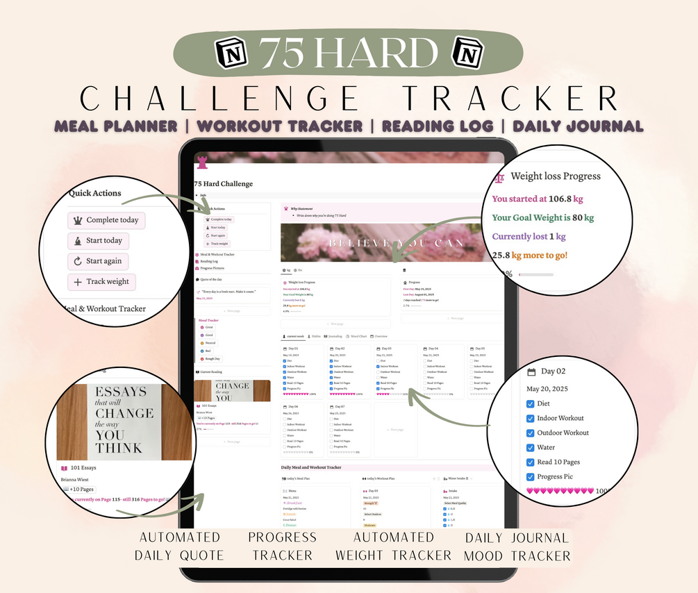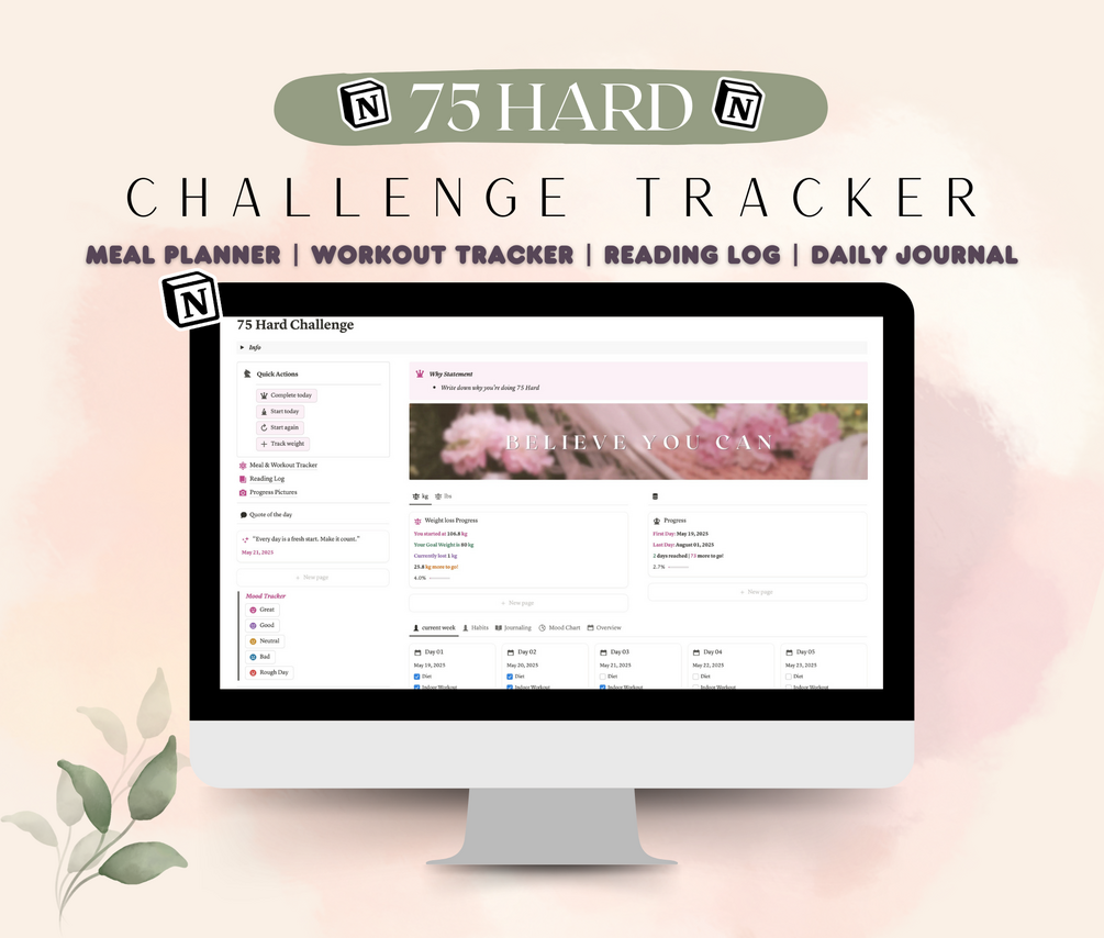 Take your 75 Hard Challenge to the next level with this beautifully designed, all-in-one Notion Template!