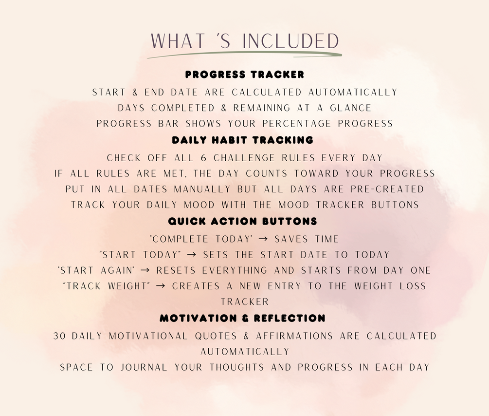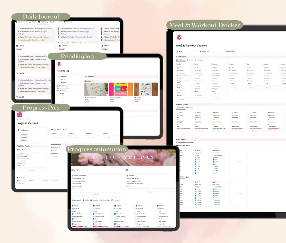 Automated daily quotes & affirmations, Mood & weight tracking, Works on all devices (mobile, tablet, desktop), Fully customizable, mostly automated, Aesthetic dashboard design with soft pink tones